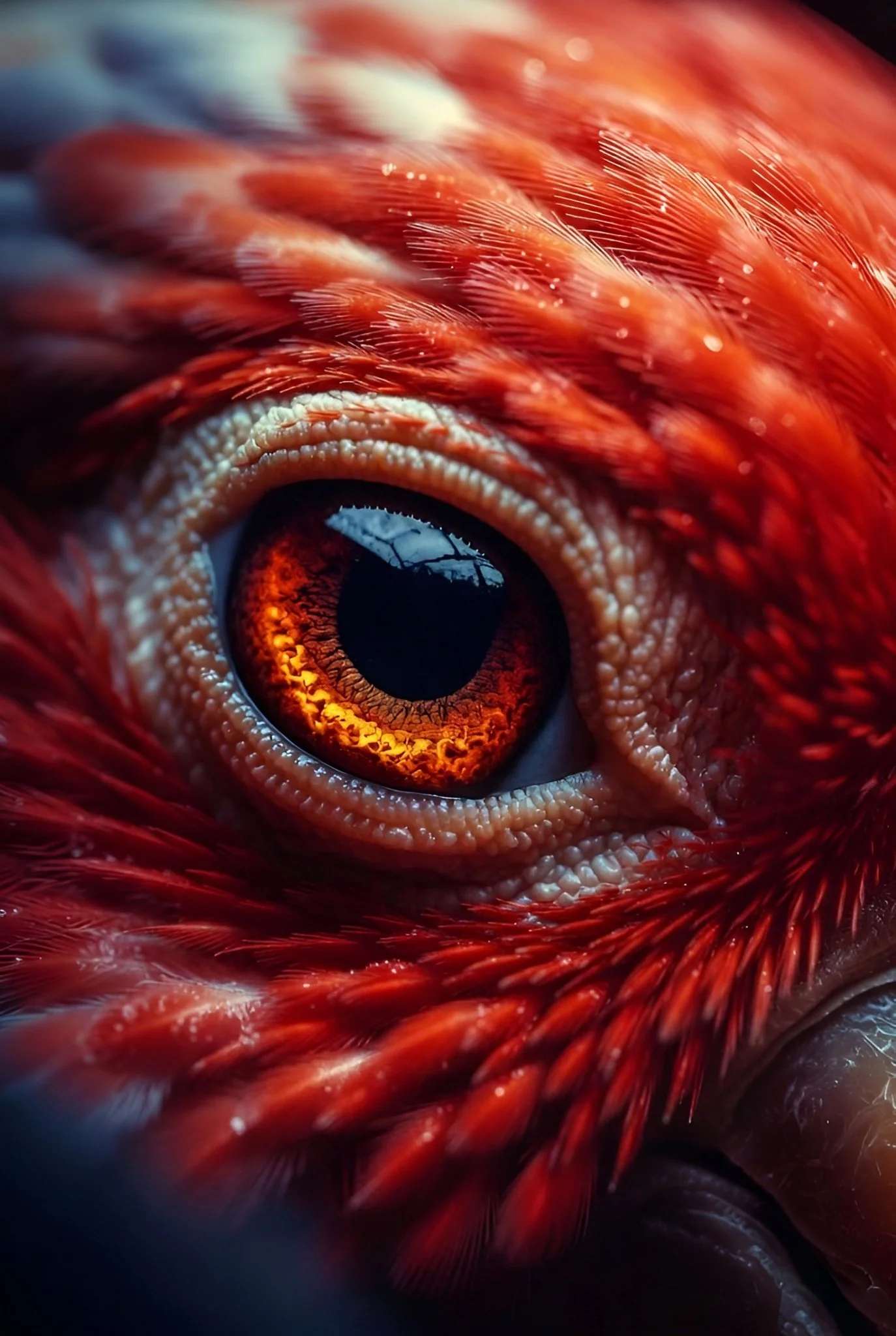 Macro product shot of vivid red parrot eye: glossy black pupil, fiery orange-red iris, crimson feather halo. Ultra-tight 15° frame, razor focus on eye reflection & feather barbs; creamy bokeh bg. Dramatic side key light right + cool rim left create wet-look highlight in pupil & satin sheen on scales. Intricate feather texture, subtle moisture beads. Palette: intense scarlet, burning orange, jet black, warm ivory sclera. Fierce, hypnotic, primal mood. 100mm macro, f/2.8, ISO 100.